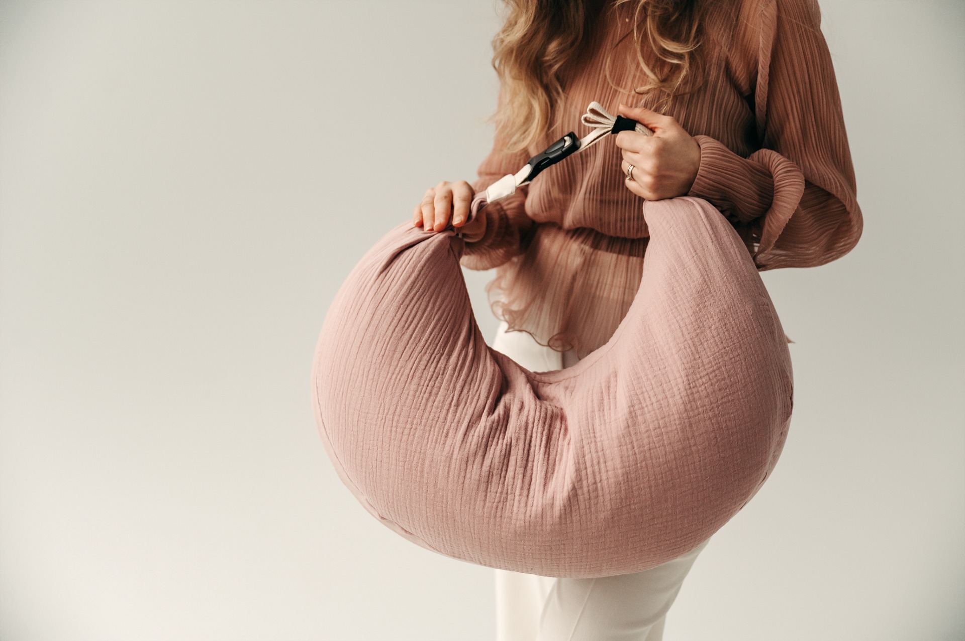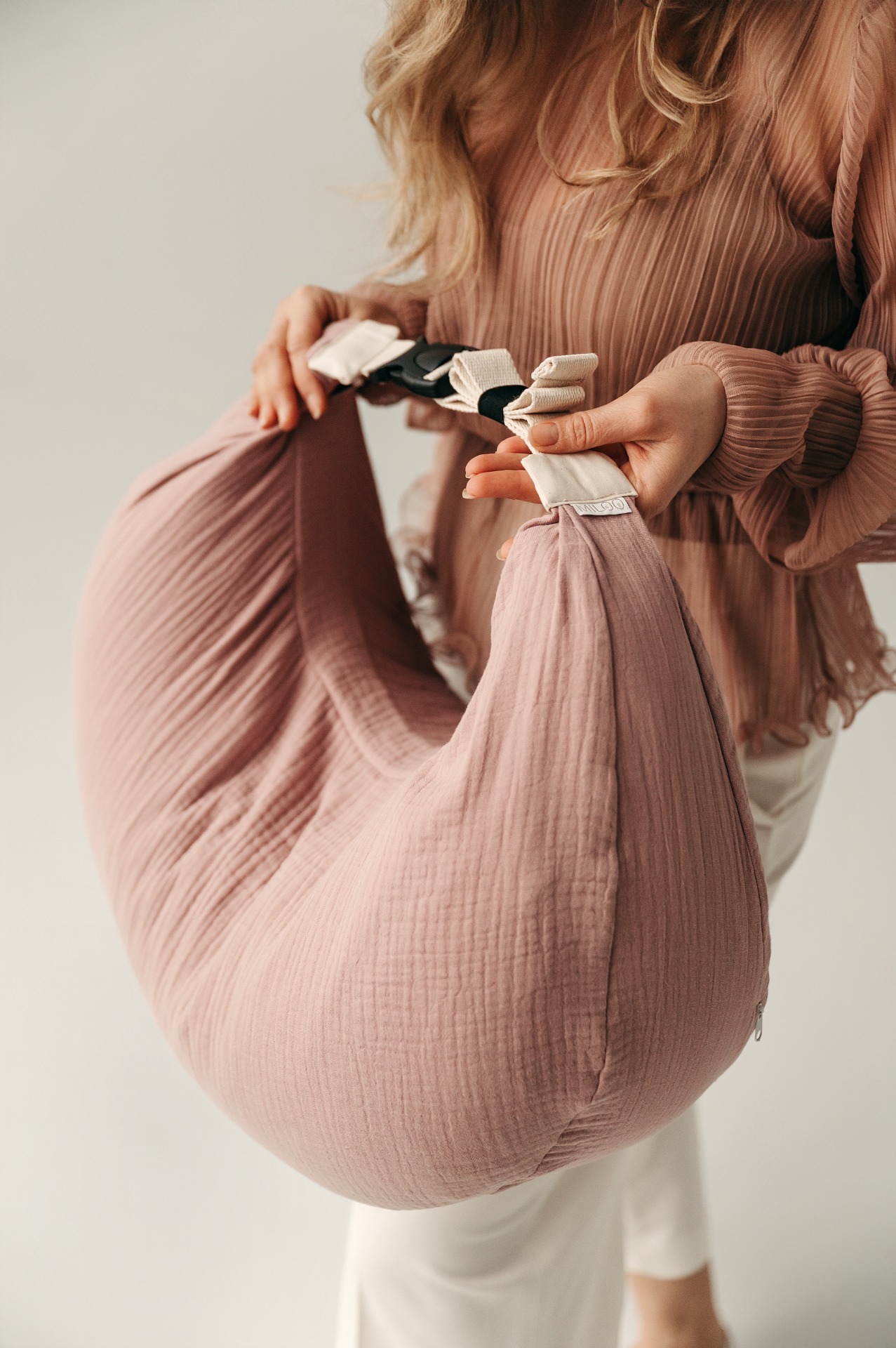 V páse si vankúš viete zapnúť, teda fixne drží a dieťatko sa z neho nešmýka. Pokiaľ ste chudšej postavy za seba medzi vankúš a zapínanie môžete dať malý vankúš, aby vás MILOO obopol, alebo na vyžiadanie ušijeme menšie opásanie. Najlepšie je zapnúť napevno, tak aby vás netlačil, ale pekne objal.